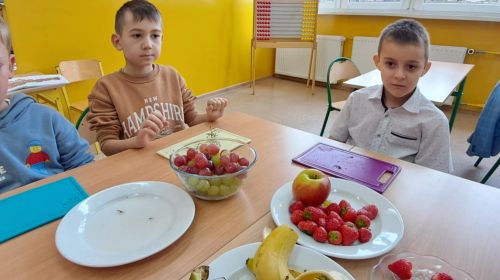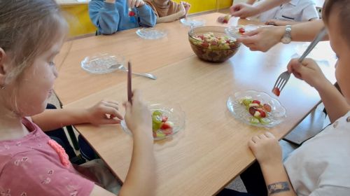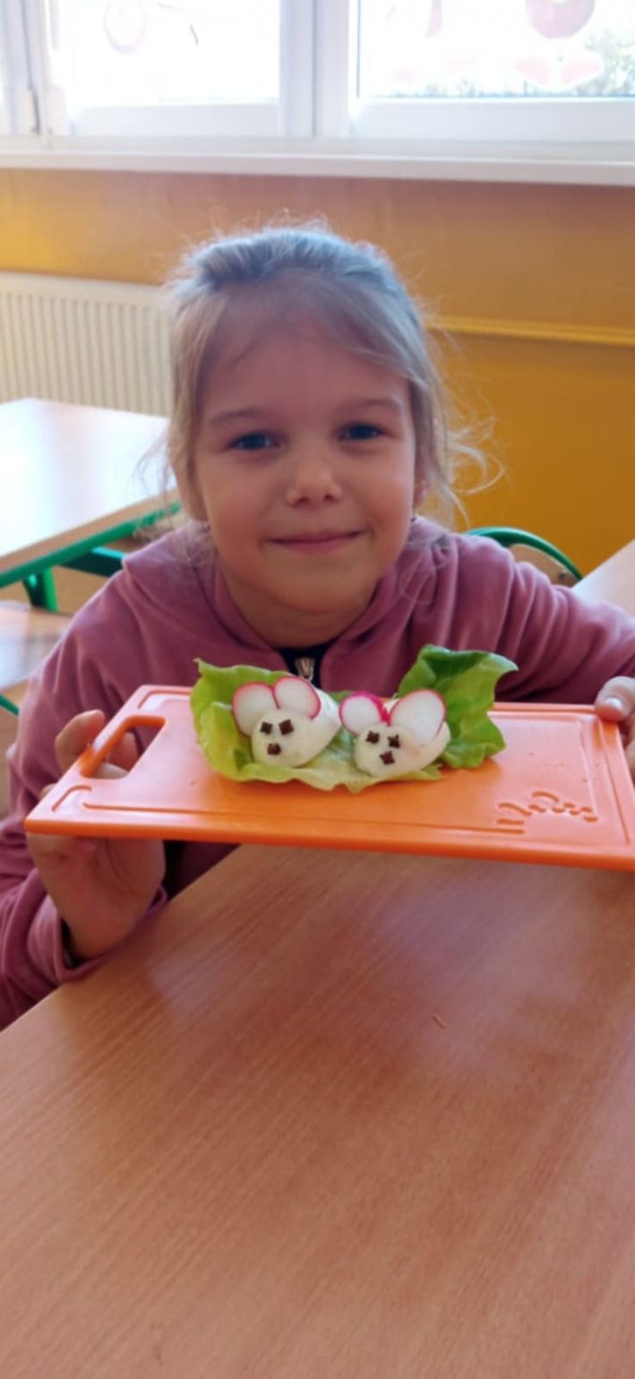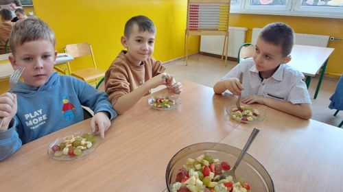 W ubiegłym tygodniu poznali literę j jak jajko oczywiście. Ćwicząc własną cierpliwość dokładnie obierali jajka ze skorupek po to, aby za chwilę zamienić je w piękne myszki. Wczoraj przyszła kolej na literę s jak sałatka i to nie byle jaka, bo owocowa - pyszna i zdrowa.