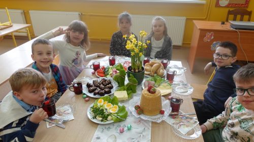 Wielkanocne śniadanko to piękna tradycja, którą pielęgnujemy również w naszej szkole. To wyjątkowy czas, kiedy uczniowie młodszych klas spotykają się z wychowawcami przy wspólnym stole, by podzielić się jajkiem, złożyć sobie życzenia i poczuć prawdziwego ducha świąt. Nie brakuje tradycyjnych potraw, kolorowych dekoracji i przede wszystkim – ciepłej, serdecznej atmosfery.