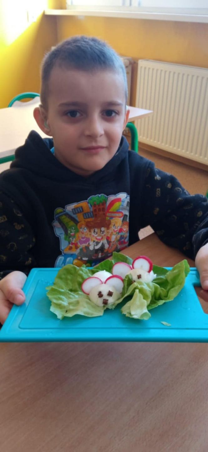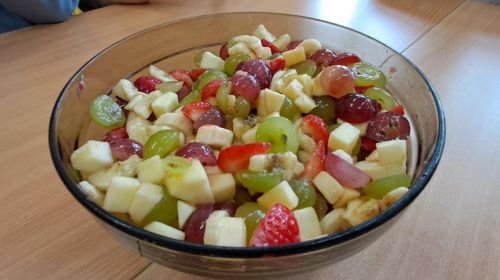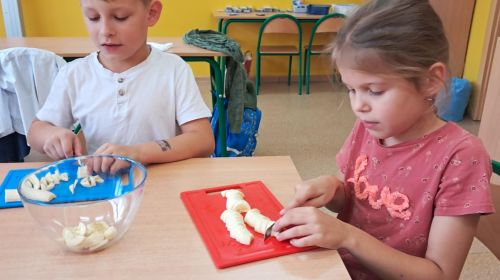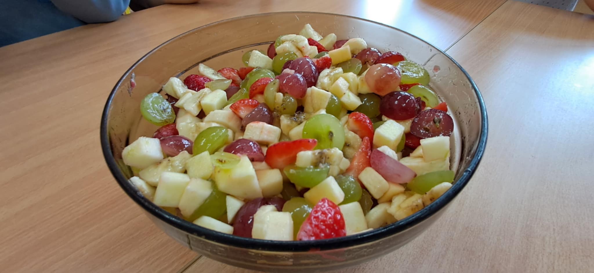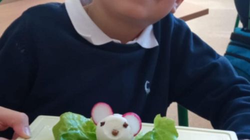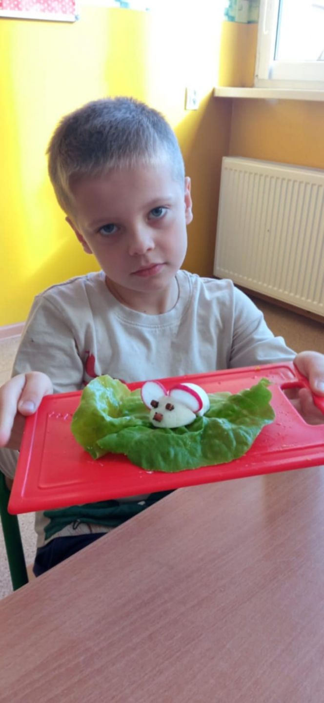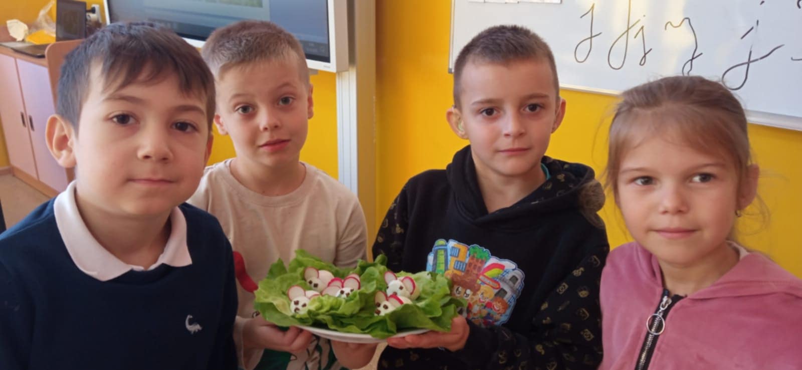 W ubiegłym tygodniu poznali literę j jak jajko oczywiście. Ćwicząc własną cierpliwość dokładnie obierali jajka ze skorupek po to, aby za chwilę zamienić je w piękne myszki. Wczoraj przyszła kolej na literę s jak sałatka i to nie byle jaka, bo owocowa - pyszna i zdrowa.