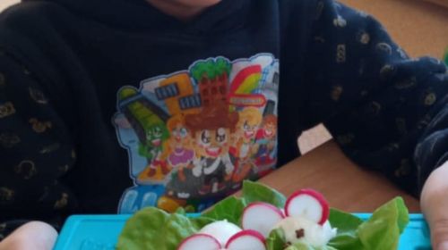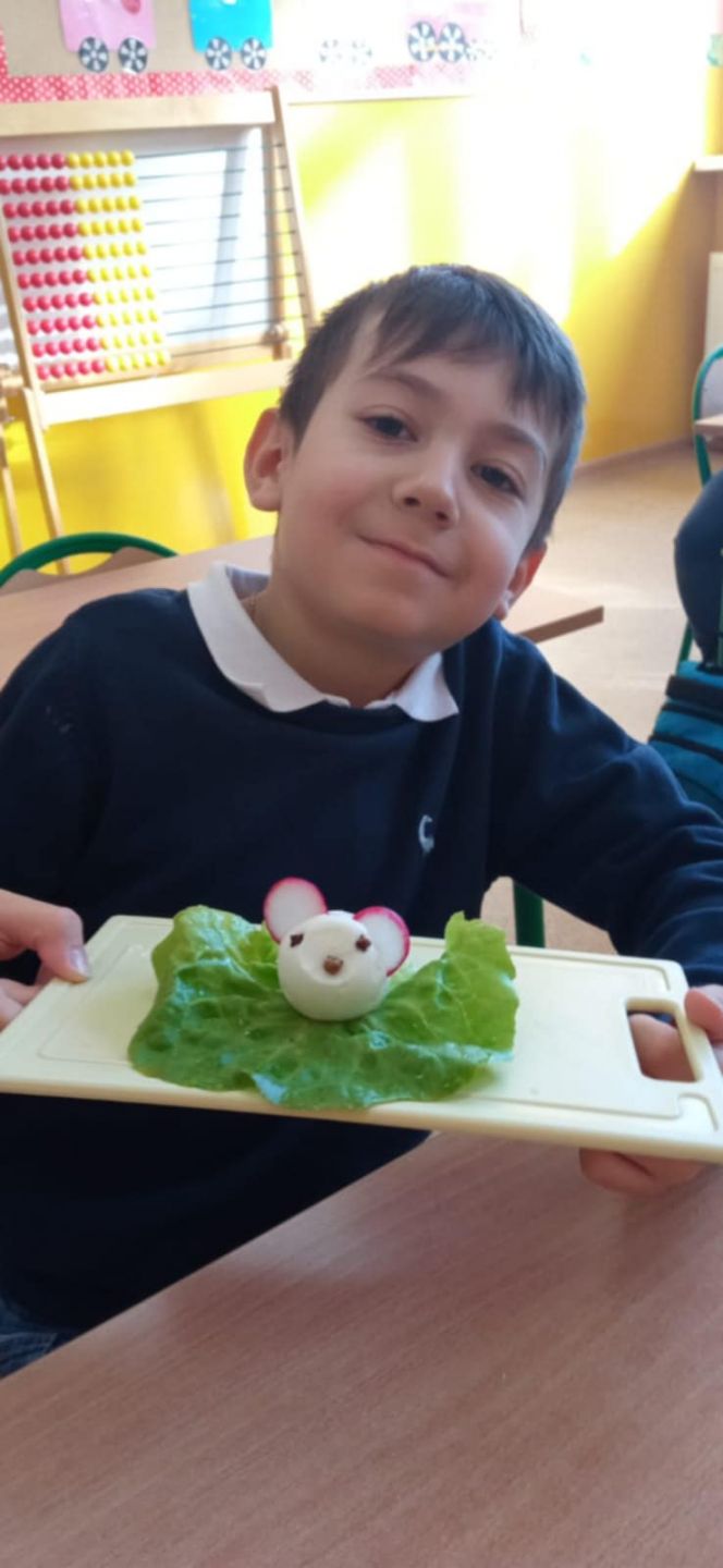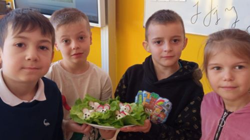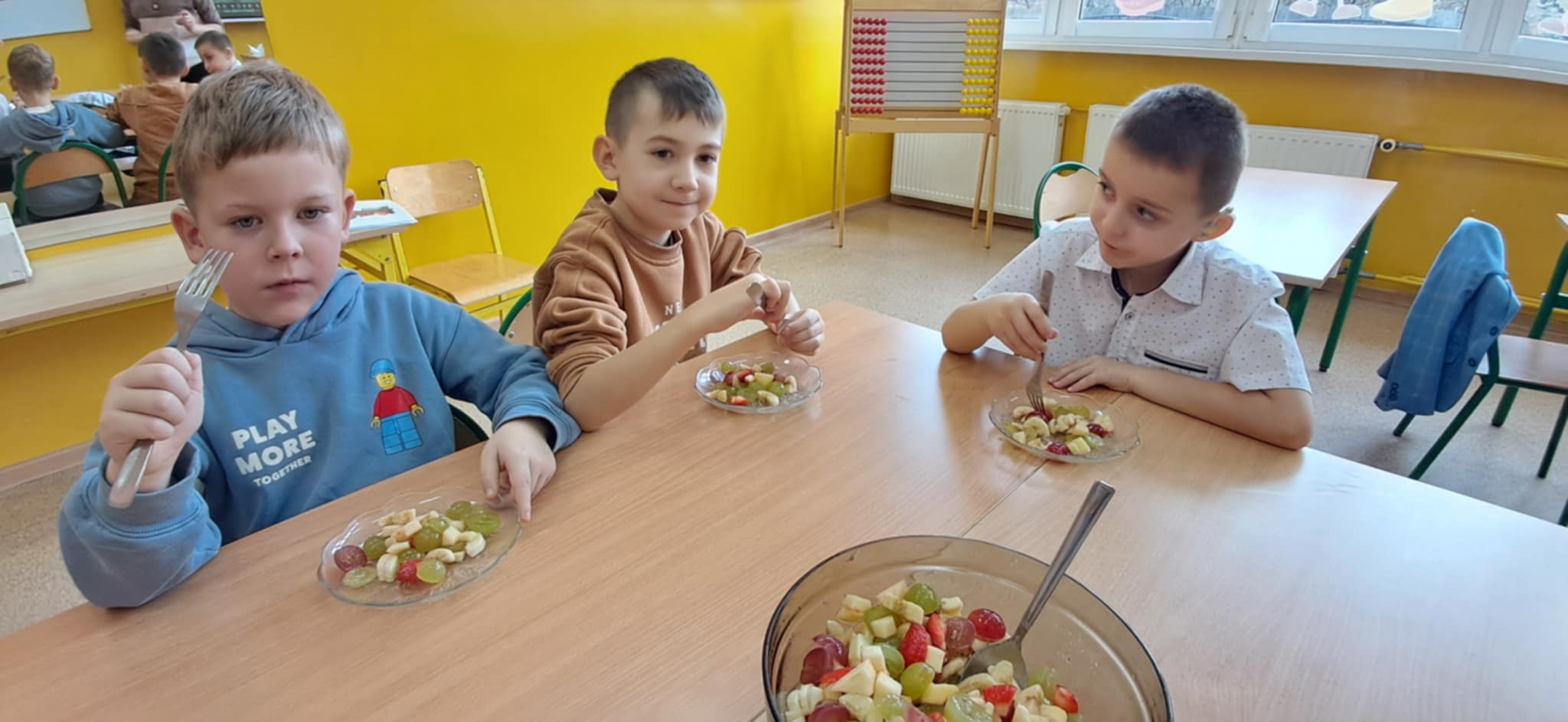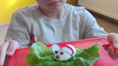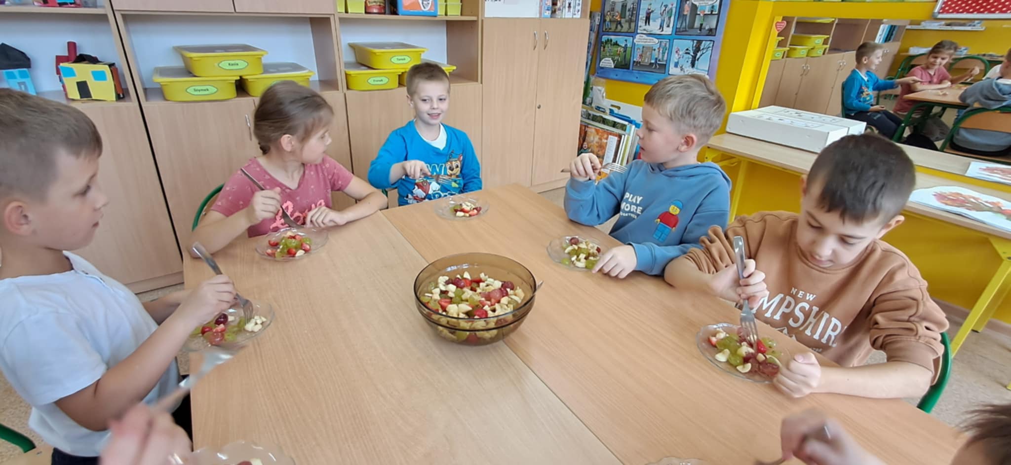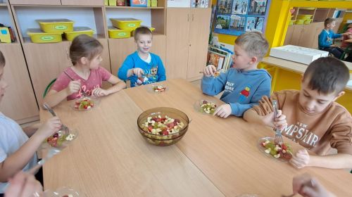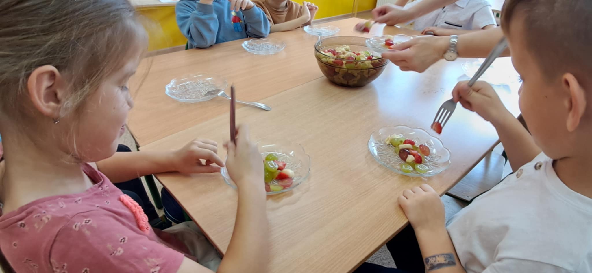 W ubiegłym tygodniu poznali literę j jak jajko oczywiście. Ćwicząc własną cierpliwość dokładnie obierali jajka ze skorupek po to, aby za chwilę zamienić je w piękne myszki. Wczoraj przyszła kolej na literę s jak sałatka i to nie byle jaka, bo owocowa - pyszna i zdrowa.