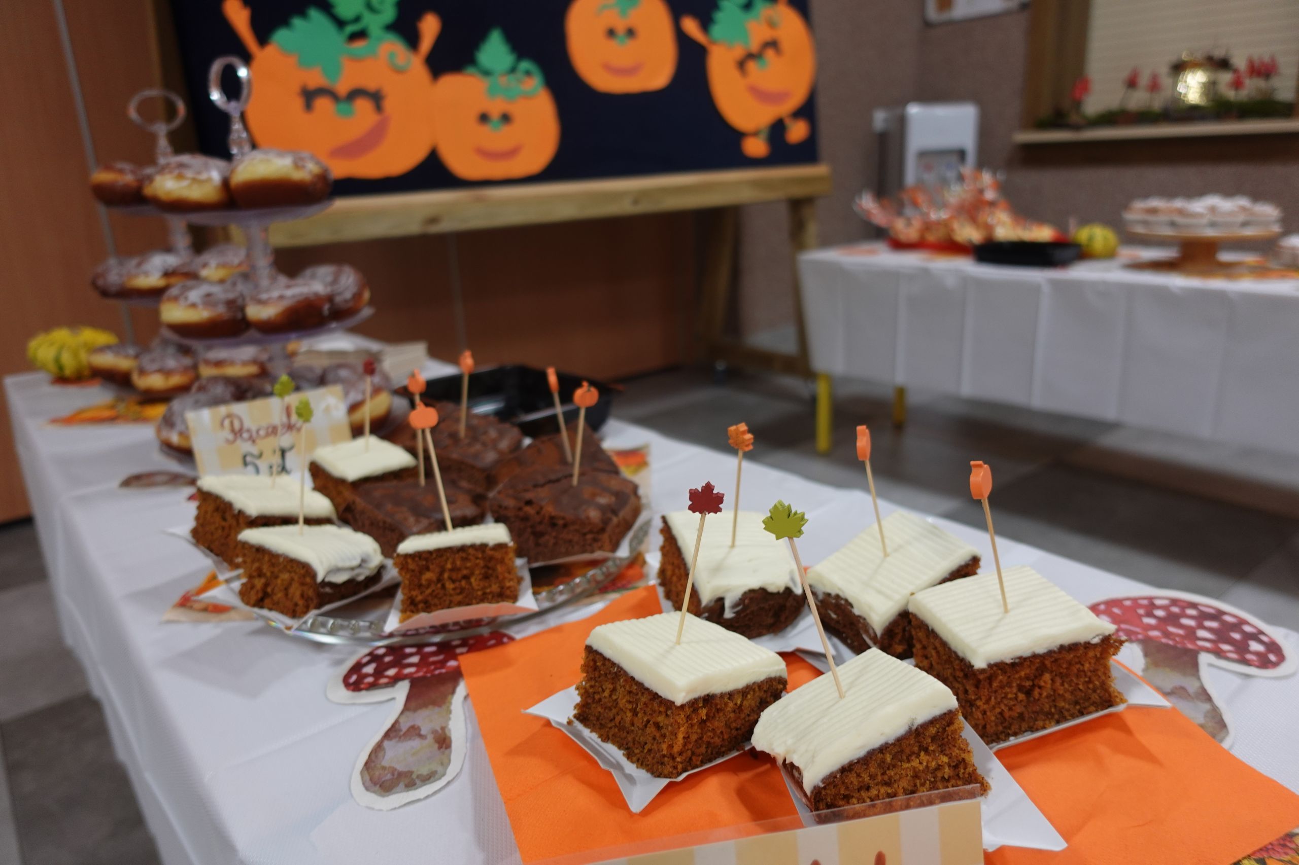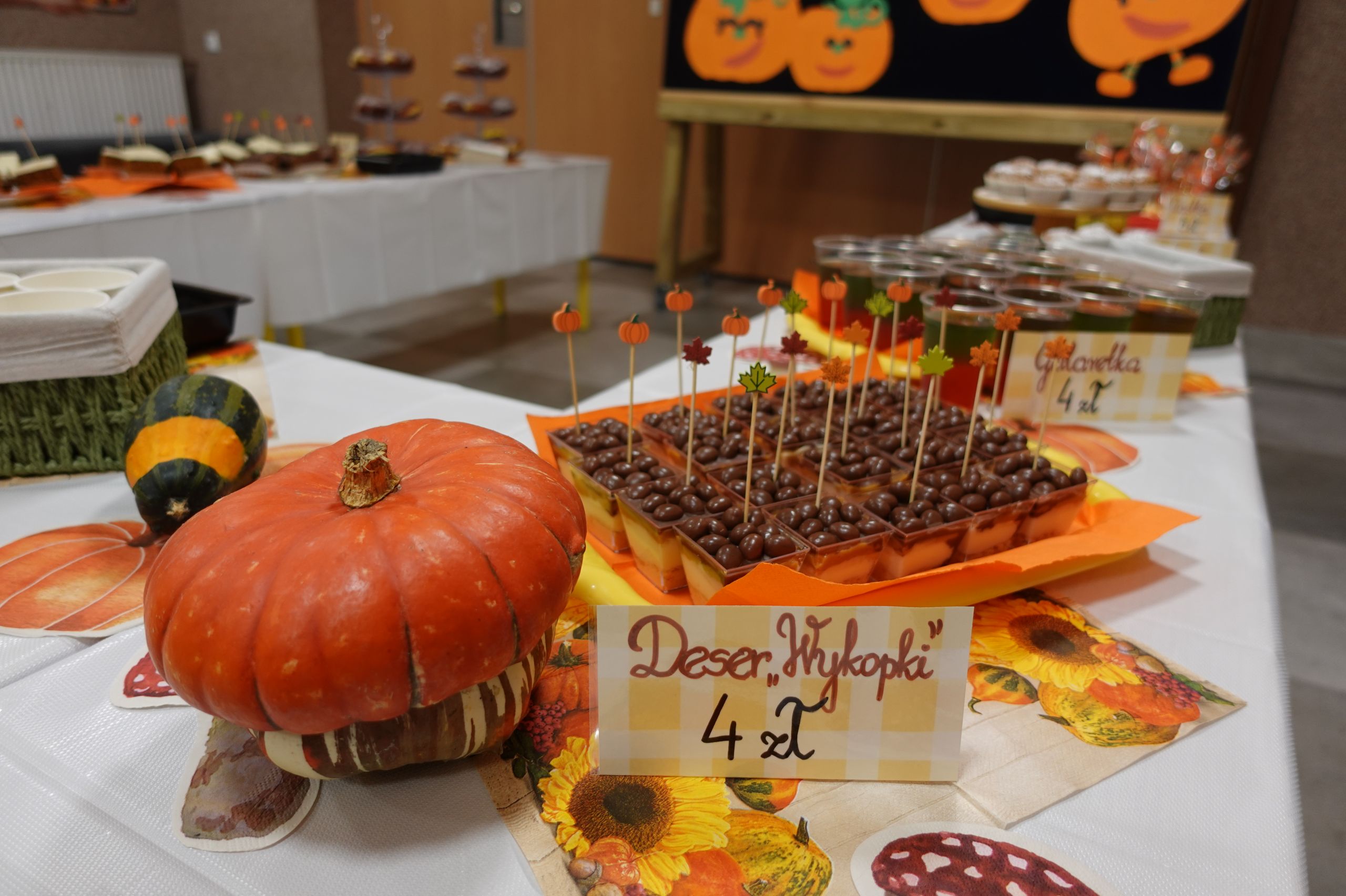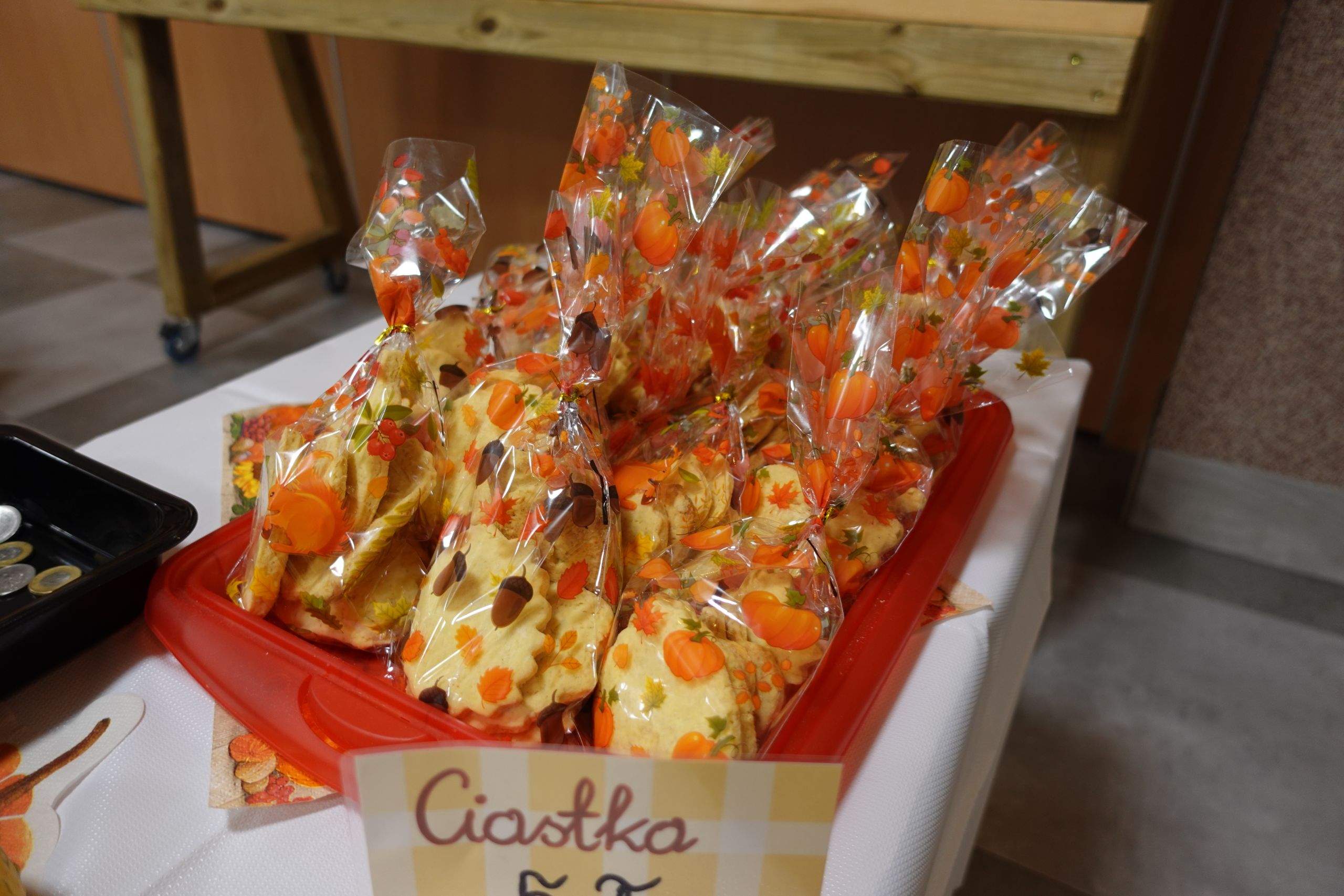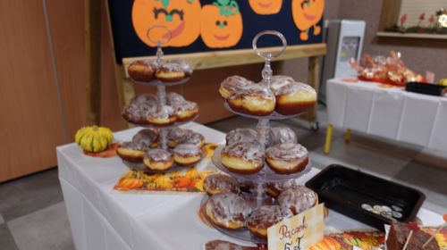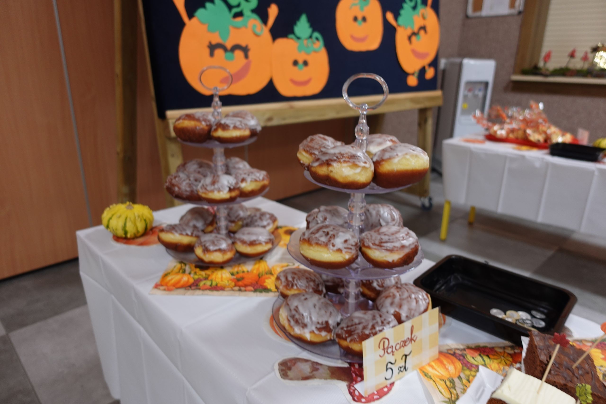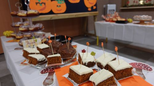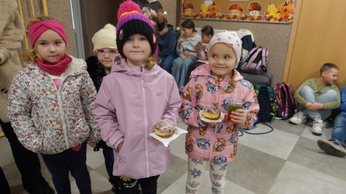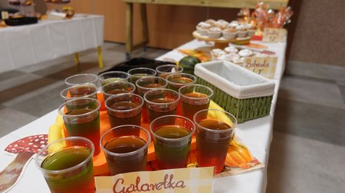 Zaczęliśmy swoją pracę od tworzenia jesiennego menu i podziału obowiązków, dzięki czemu udało nam się przygotować ciasteczka, babeczki, galaretki, ciasto murzynek oraz pyszne kakao. Na naszych stołach gościły też kuszące pączki, deserki oraz ciasto marchewkowe. Dzięki naszym pomocnym mamom p. Bożence i p. Kasi mogliśmy ugasić nasze pragnienia smaczną lemoniadą. Nie zabrakło również jesiennego duszka, któremu serdecznie dziękujemy za złożony dar. Włożyliśmy w ten jarmark wiele naszych mniejszych i większych serduszek, które sprawiły, że odnieśliśmy ogromny sukces.