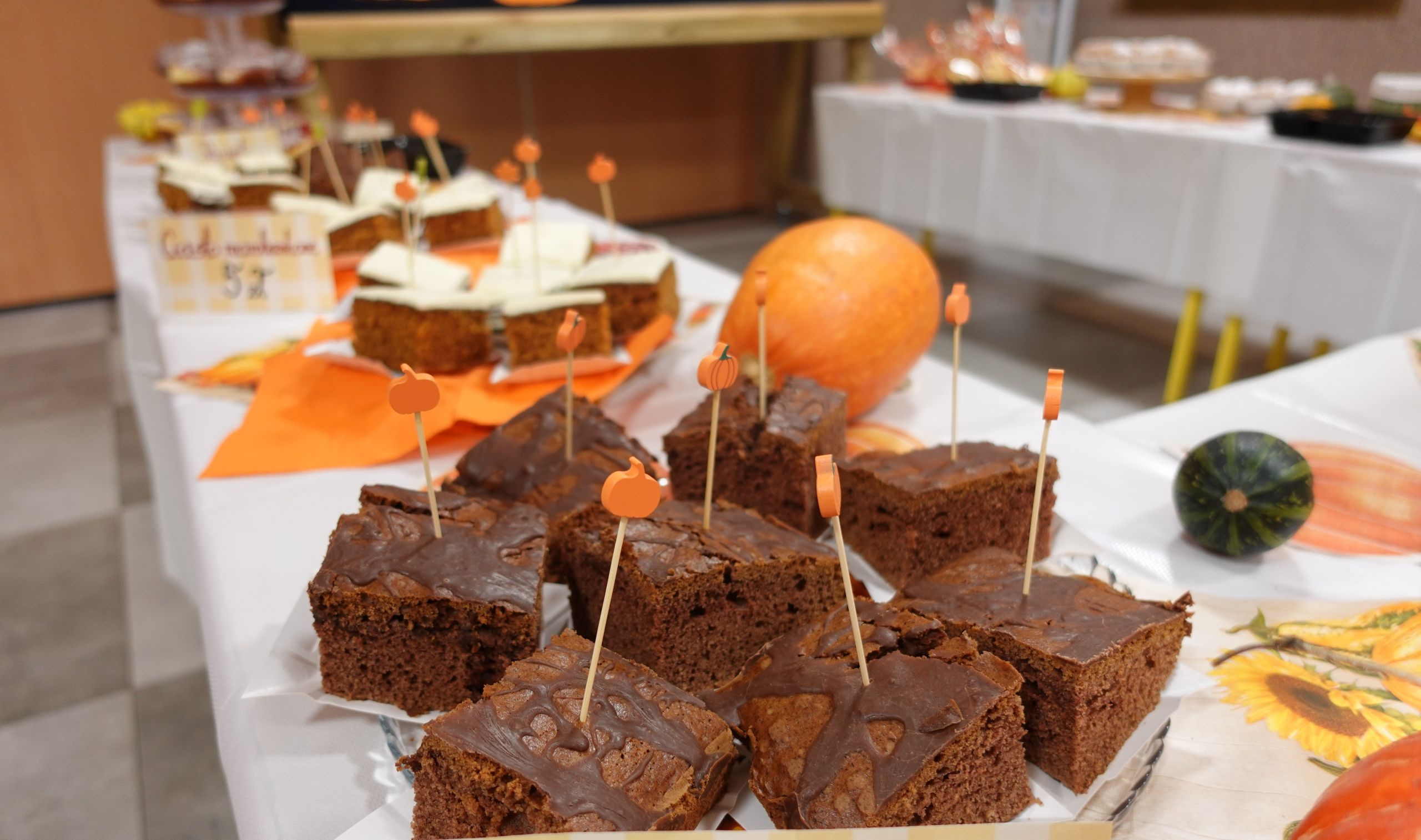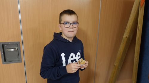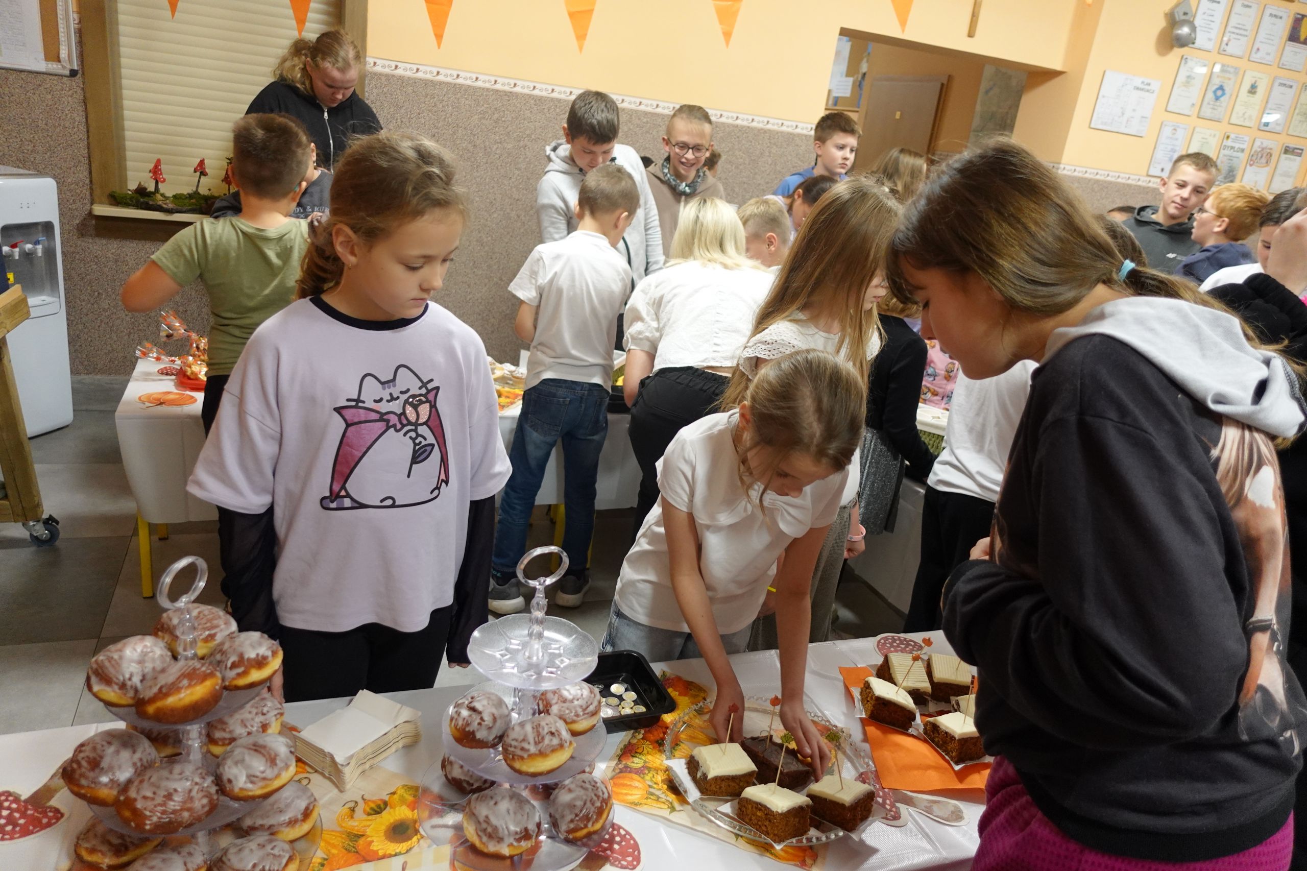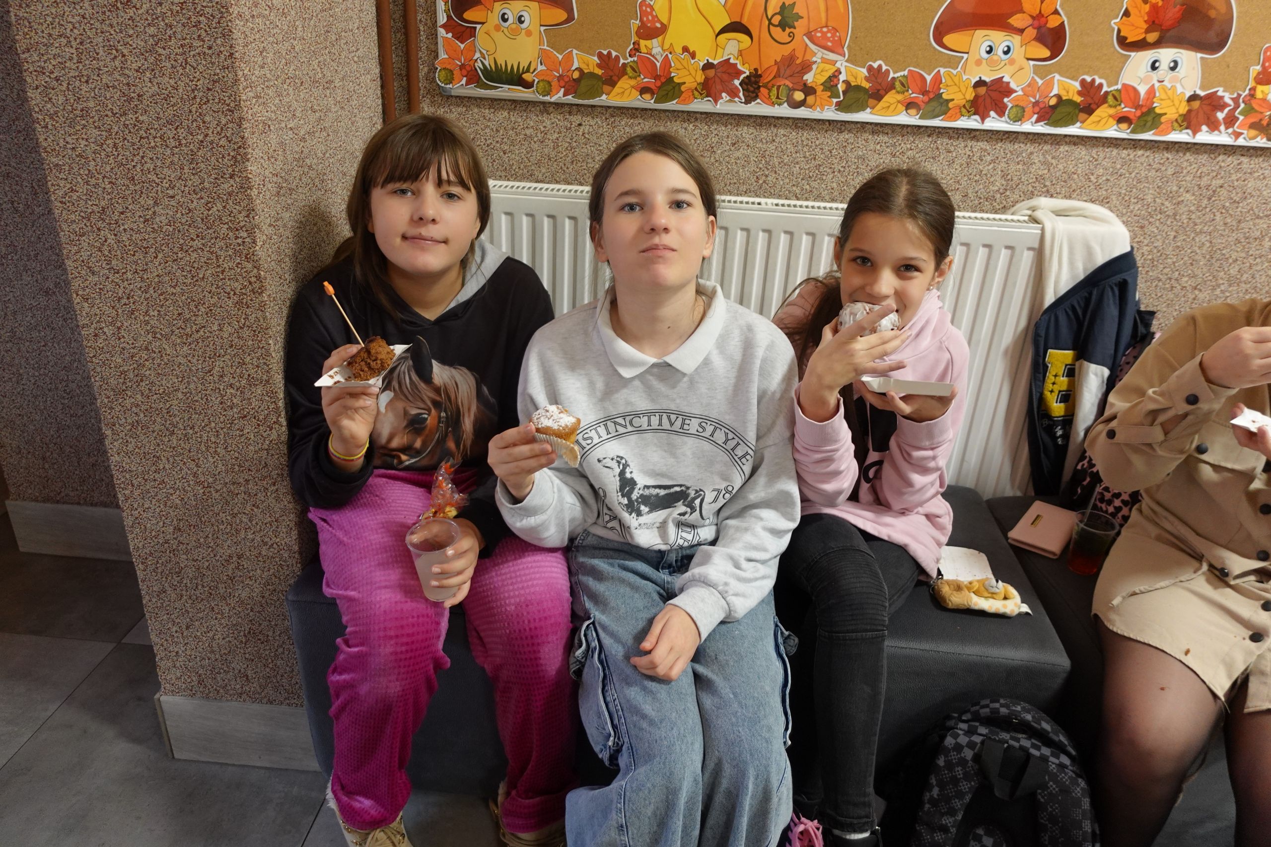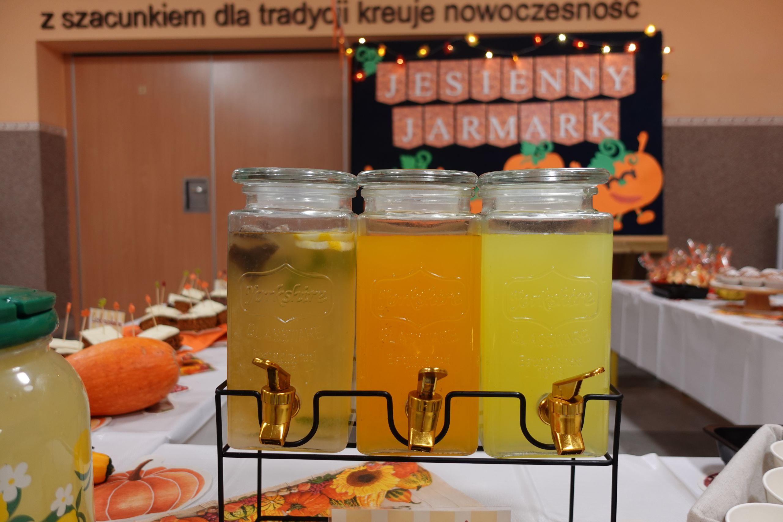 Zaczęliśmy swoją pracę od tworzenia jesiennego menu i podziału obowiązków, dzięki czemu udało nam się przygotować ciasteczka, babeczki, galaretki, ciasto murzynek oraz pyszne kakao. Na naszych stołach gościły też kuszące pączki, deserki oraz ciasto marchewkowe. Dzięki naszym pomocnym mamom p. Bożence i p. Kasi mogliśmy ugasić nasze pragnienia smaczną lemoniadą. Nie zabrakło również jesiennego duszka, któremu serdecznie dziękujemy za złożony dar. Włożyliśmy w ten jarmark wiele naszych mniejszych i większych serduszek, które sprawiły, że odnieśliśmy ogromny sukces.